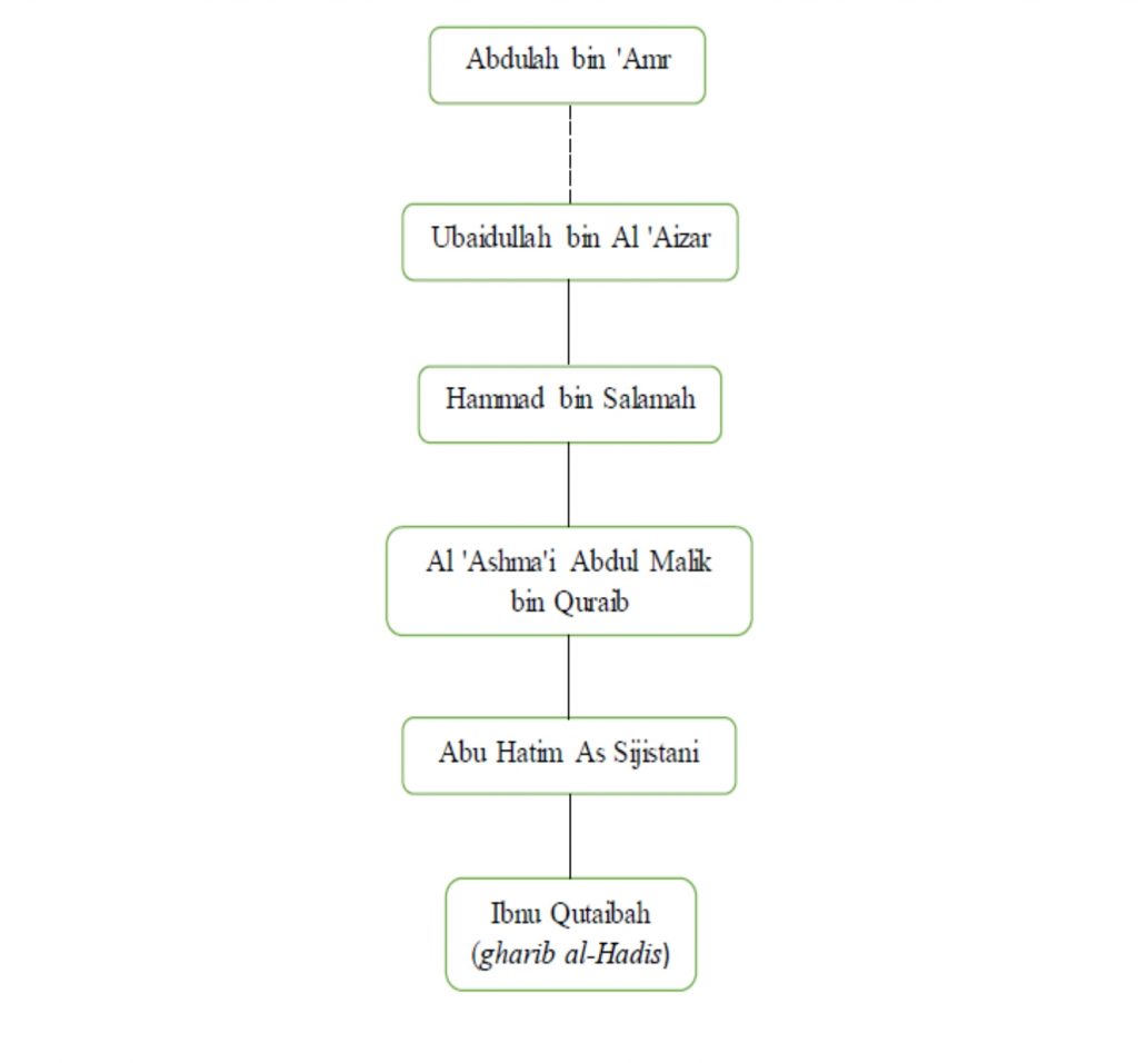 Ibnu Qutaibah meriwayatkan atsar di atas dalam gharib al-Hadis, dari Abu Hatim As Sijistani, dari Al Ashma’i, dari Hammad bin Salamah, dari Ubaidullah bin ‘Aizar, dari Abdulah bin ‘Amr radhiyallahu ‘anhu, dengan redaksi: