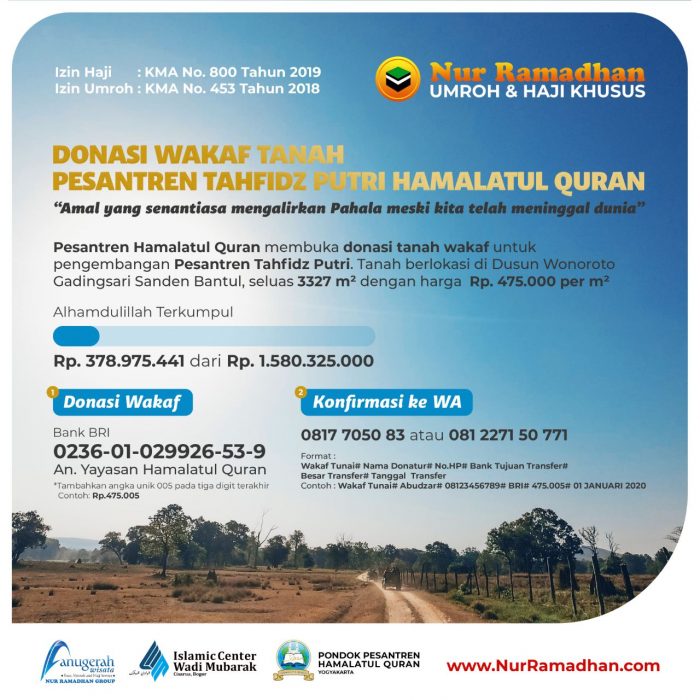 Untuk itu kami mengajak kaum muslimin sekalian, bersama membebaskan tanah calon Pondok Pesantren Tahfidz Hamalatul Quran Putri. Berikut ini informasi selengkapnya :