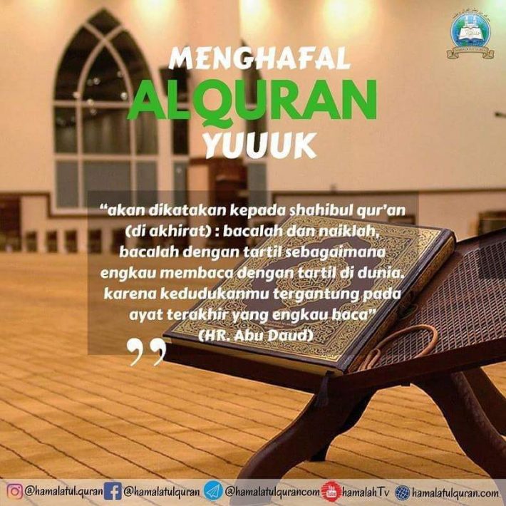 “Akan dikatakan kepada shahibul qur’an (di akhirat) : bacalah dan naiklah, bacalah dengan tartil sebagaimana engkau membaca dengan tartil di dunia. karena kedudukanmu tergantung pada ayat terakhir yang engkau baca.” (HR Abu Daud)