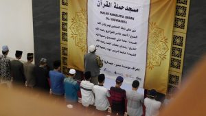 Sholat jamaah dimasjid baru, Masjid Jami Hamalatul Quran Sanden.