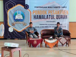 Pertemuan wali santri baru dilakukan dengan menggunakan platform zoom dan dimulai pada pukul 08.30 – 11.00 WIB dengan dihadiri langsung oleh seluruh pengurus Pondok Pesantren Hamalatul Quran, Yogyakarta.