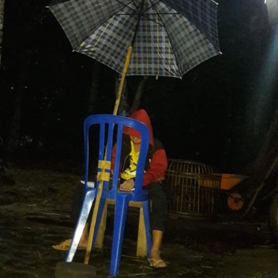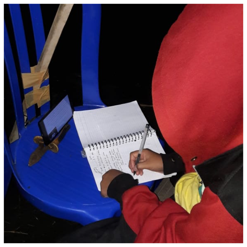 Salah satu yg membuat kami kagum adalah, potret santri dari lereng merapi yang mencatat materi pelajaran online di halaman rumahnya. Bertemankan kursi dan payung karena kondisi sedang hujan, di pekarangan rumah. Untuk mencari sinyal lebih kuat.