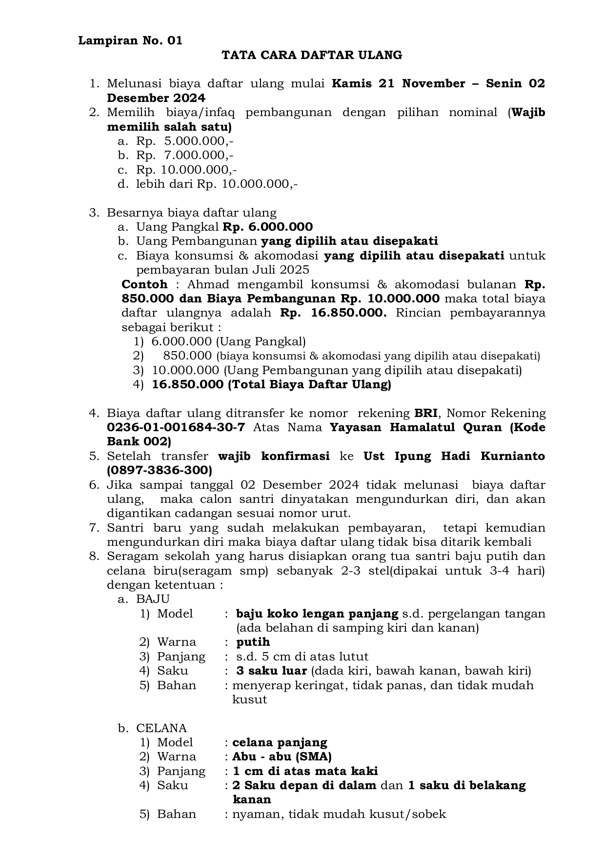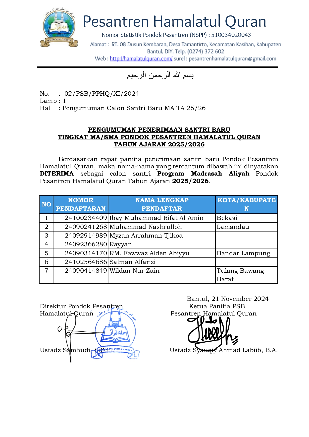 Berdasarkan rapat Panitia Penerimaan Santri Baru Pondok Pesantren Hamalatul Quran, maka nama-nama yang tercantum dibawah ini dinyatakan DITERIMA sebagai calon santri baru Program Madrasah Aliyah Pondok Pesantren Hamalatul Quran Tahun Ajaran 2025/2026.