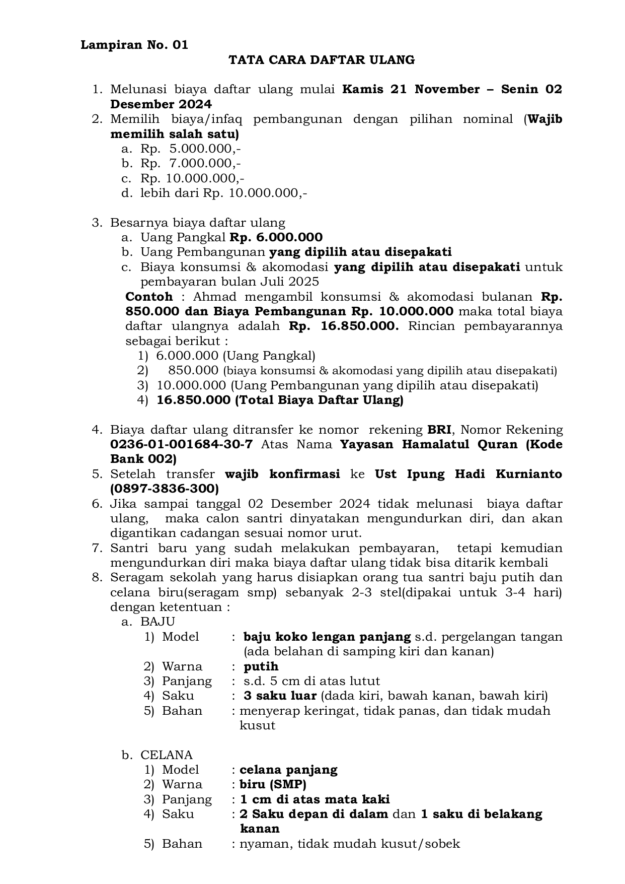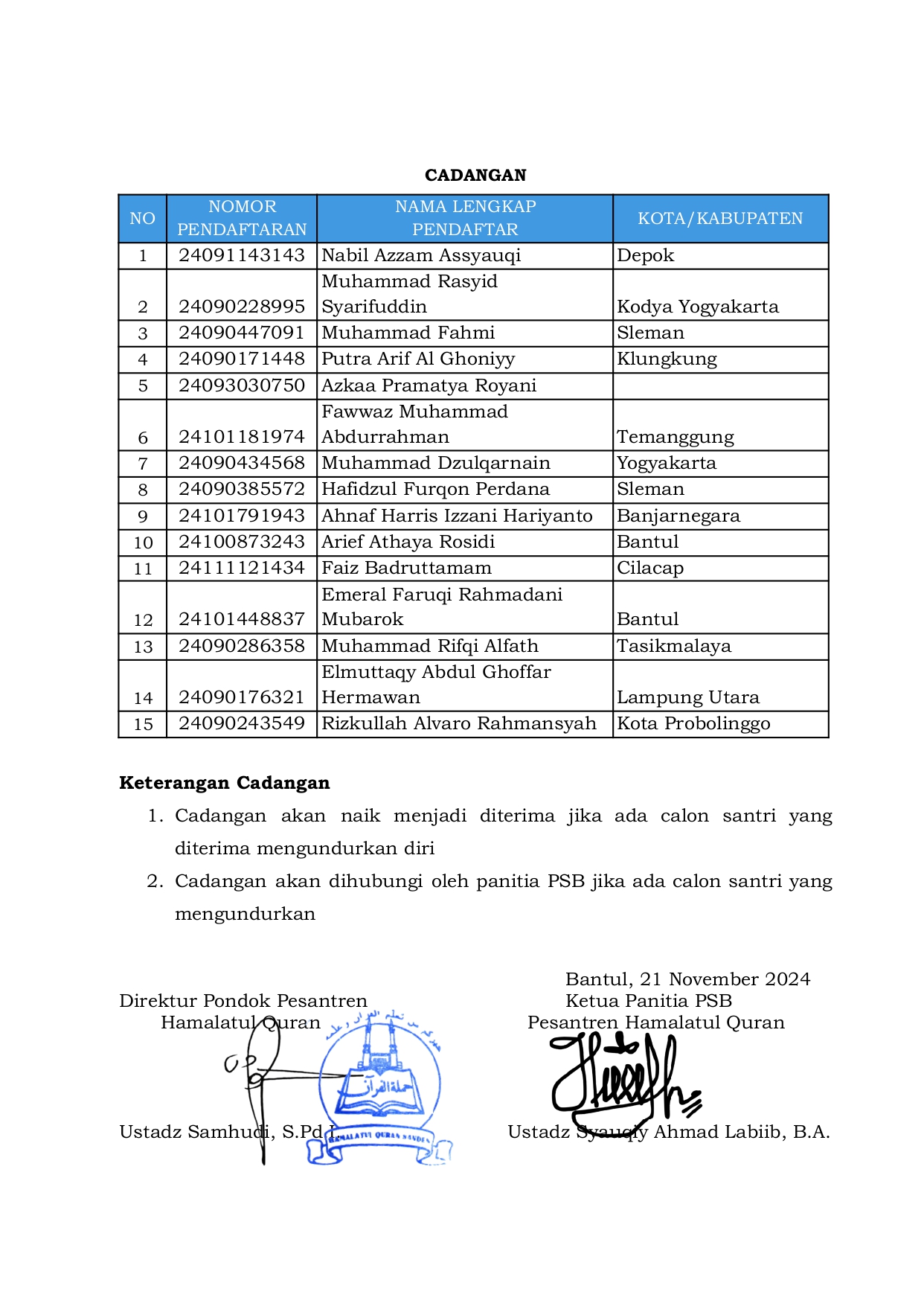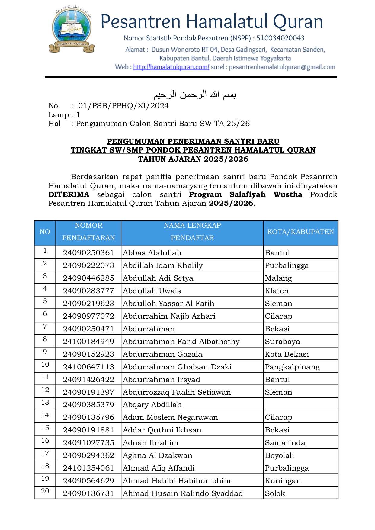 Berdasarkan rapat Panitia Penerimaan Santri Baru Pondok Pesantren Hamalatul Quran, maka nama-nama yang tercantum dibawah ini dinyatakan DITERIMA sebagai calon santri baru Program Salafiyah Wustha Pondok Pesantren Hamalatul Quran Tahun Ajaran 2025/2026.