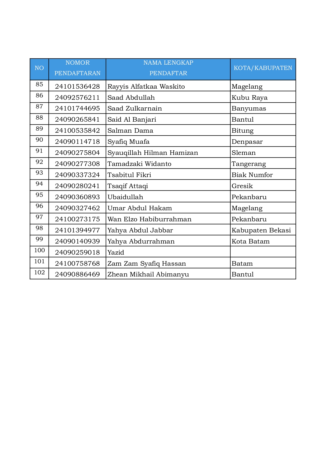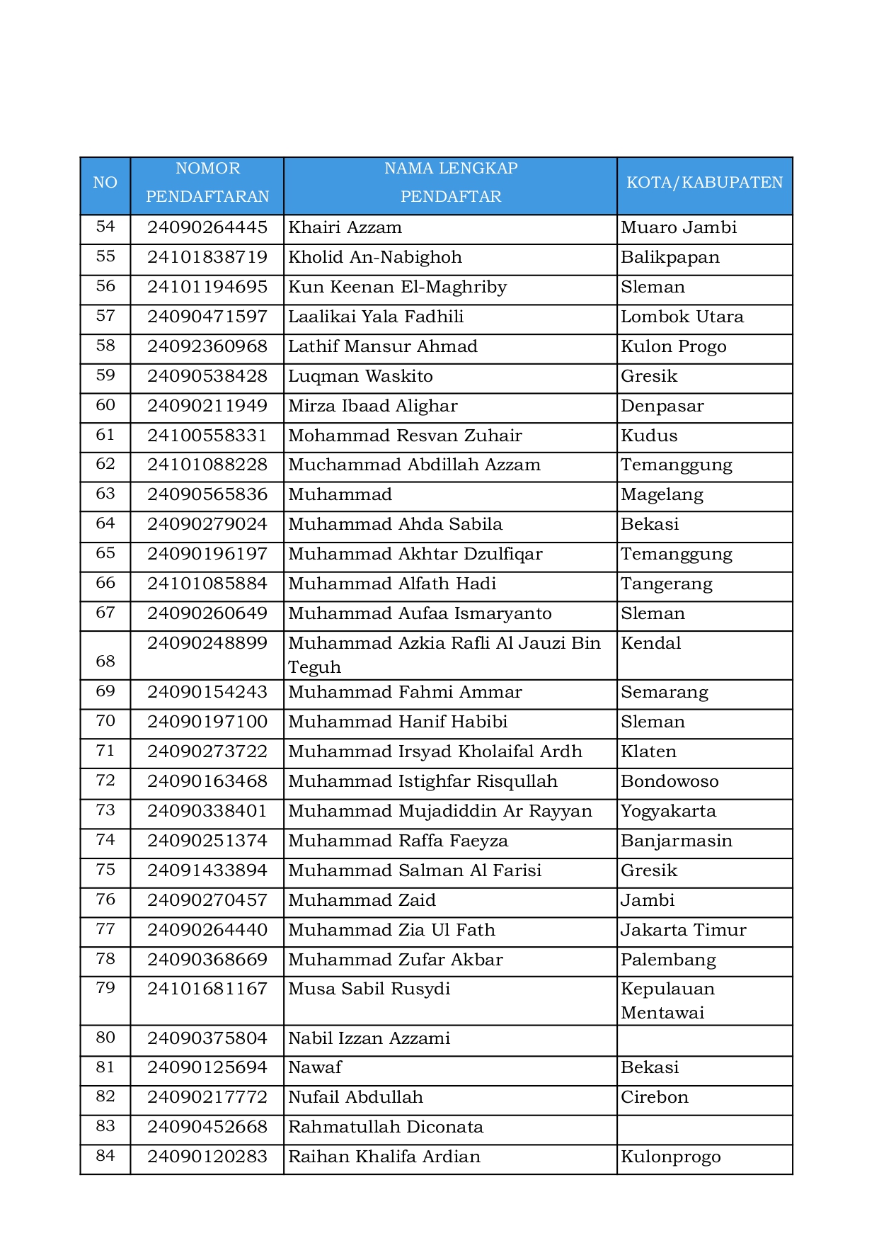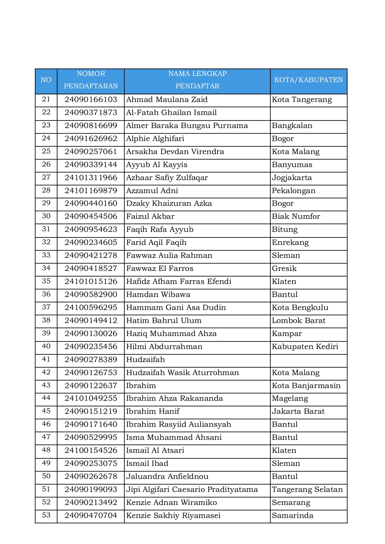 Berdasarkan rapat Panitia Penerimaan Santri Baru Pondok Pesantren Hamalatul Quran, maka nama-nama yang tercantum dibawah ini dinyatakan DITERIMA sebagai calon santri baru Program Salafiyah Wustha Pondok Pesantren Hamalatul Quran Tahun Ajaran 2025/2026.